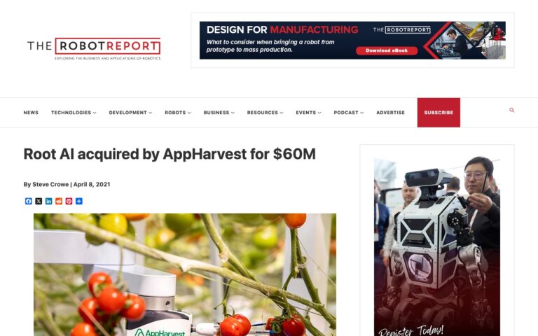 - Root AI raises $7.2M to overhaul the food economy with crop-picking robots https://www.americaninno.com/boston/funding-boston/root-ai-raises-7-2m-to-overhaul-the-food-economy-with-crop-picking-robots/?mc_cid=f5169522ff&mc_eid=80dc879ebf