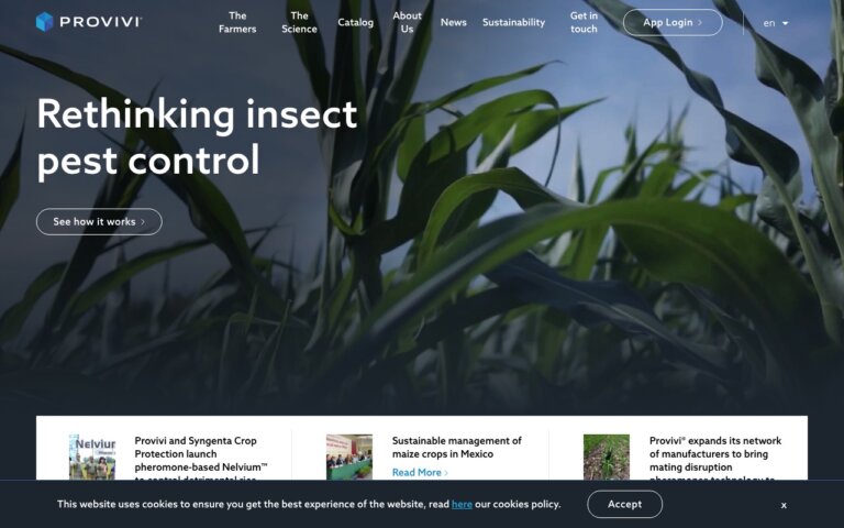 フェロモンによる交信撹乱技術自体は以前から存在していましたが、従来はフェロモンの合成コストが極めて高く、ブドウやリンゴなど高価値作物にしか経済的に導入できませんでした。Proviviは独自の生合成プロセスにより、フェロモンの製造コストを大幅に引き下げ、トウモロコシや水稲といった大面積の畑作物にも適用可能にした点が画期的です。
