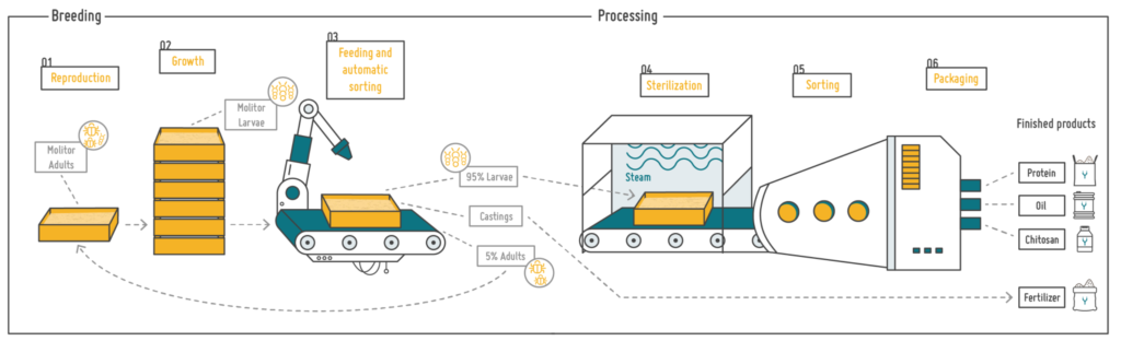 成熟段階に達すると、95%は化学薬品を使用することなく蒸して殺菌し、高品質なタンパク質とオイルに加工されます。残りの5%は成虫になるまで育成し、繁殖させます。