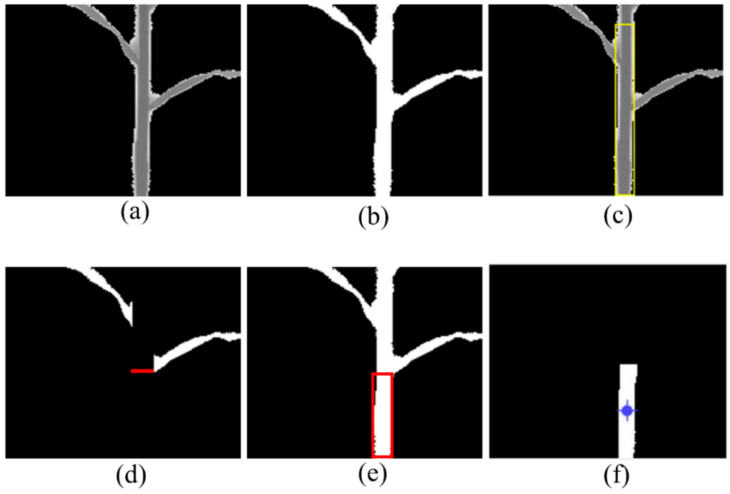 (図6より 茎をつかむ部位を解析する様子, e:葉が無く、つかむことが可能なエリアを示す、f:実際につかむ目標地点)