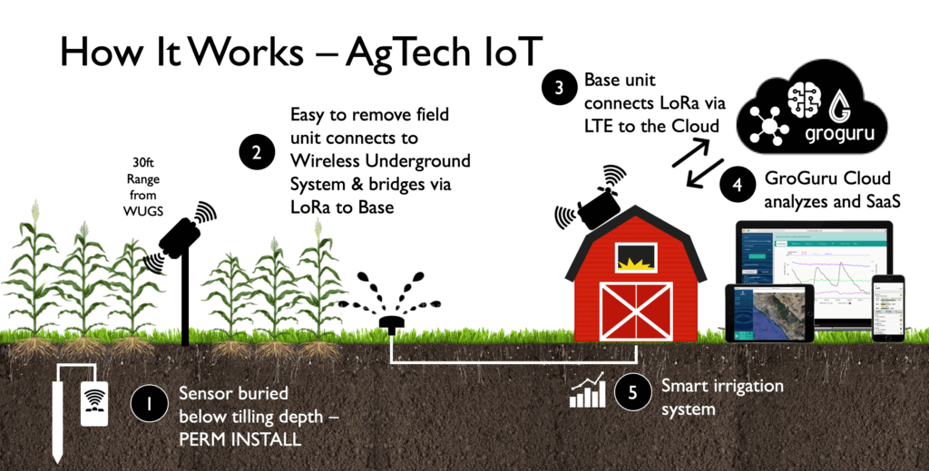 GroGuru社が特許を取得した100%ワイヤレス地下システム(WUGS)は、トウモロコシ、大豆、小麦、綿花、ソルガムなどの一年草の畑作物であっても、土壌センサーを恒久的に設置することが可能です。今日市場に出ているほとんどの土壌水分センサーはケーブルを使用しているため、トウモロコシ、大豆、綿花、小麦、ソルガム、アルファルファなどの一年生作物では、センサーの設置と撤去を毎年行う必要があります。