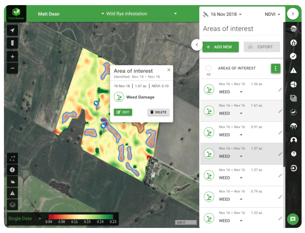 窒素は作物の三大元素のひとつであり、欠乏しても過剰になっても生育障害を招きます。FluroSense のオプションのひとつ FluroSense Insights + N Rx を契約すると、作物の窒素利用状況を可視化できる林冠葉緑素指数(Crop Canopy Chlorophyll Index; CCCI)という指標を提供してくれます。