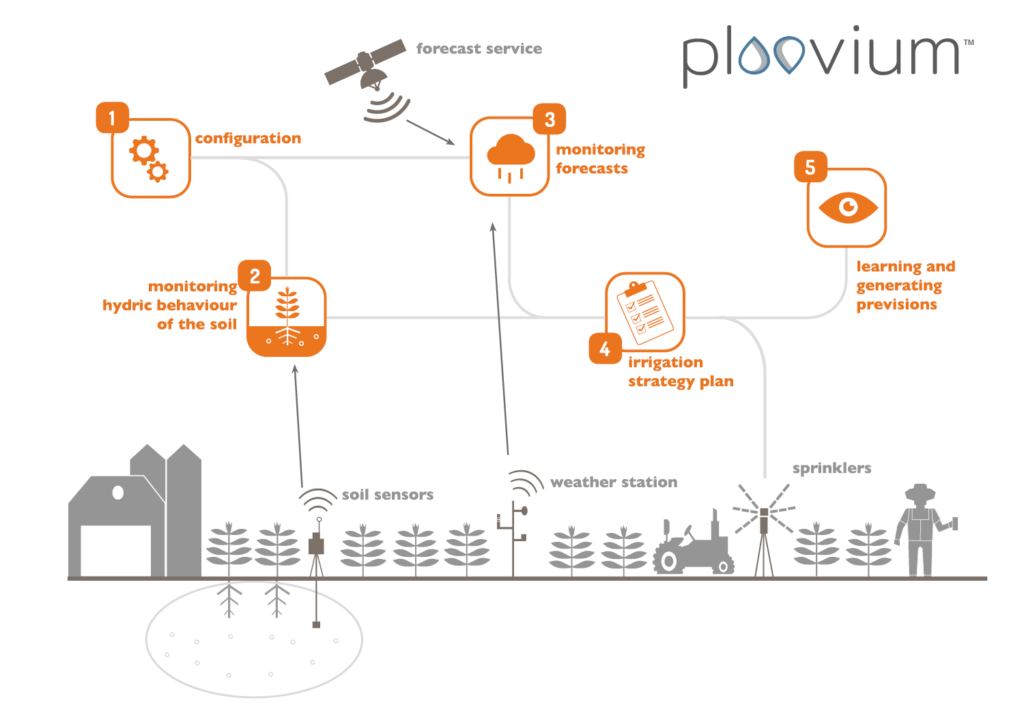 Plooviumは分析、人工知能、ビッグデータ管理、検出センサー、機械的アクチュエータの技術をベースにしています。そのため生産者は計画を手動で入力するのではなく、アプリケーションが作物の履歴、センサーデータ、農場の地理的位置にある天気予報をデータとして取り込み、ソフトウェアによって自動的に生成され、更新されます。